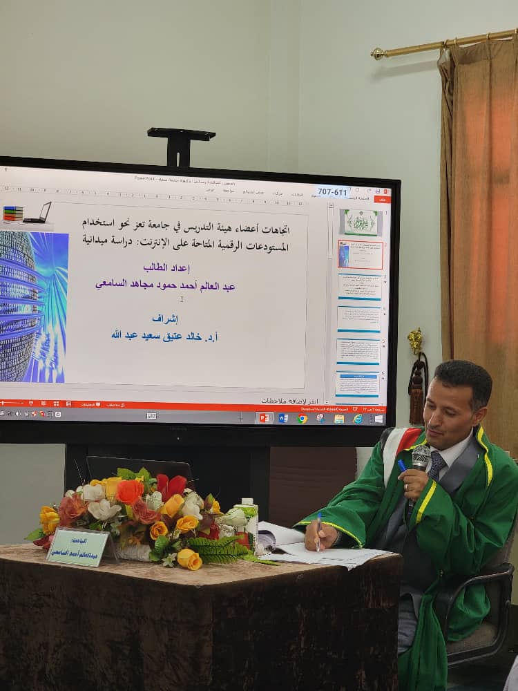 نال الباحث عبدالعالم أحمد حمود السامعي درجة الدكتوراه بإمتياز من قسم المكتبات وعلم المعلومات بكلية الآداب جامعة صنعاء عن أطروحته الموسومه ” إتجاهات أعضاء هيئة التدريس بجامعة تعز نحو إستخدام المستودعات الرقمية المتاحة على الإنترنت.. دراسة ميدانية”