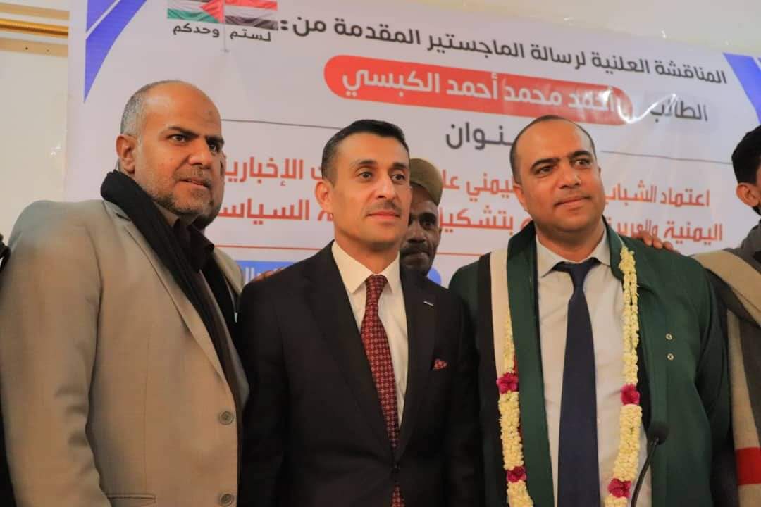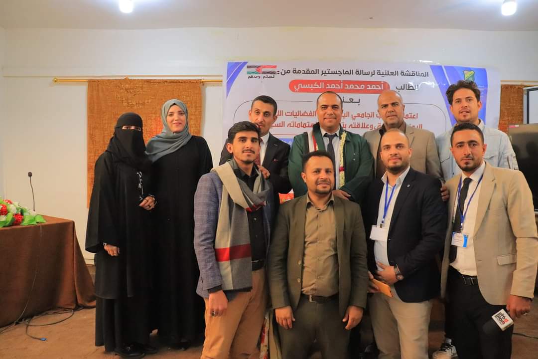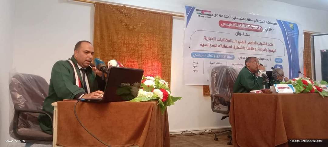 نال الباحث أحمد محمد أحمد الكبسي درجة الماجستير بتقدير امتياز 95%، من قسم الإذاعة والتليفزيون بكلية الإعلام بجامعة صنعاء عن رسالته الموسومة بـ “اعتماد الشباب الجامعي اليمني على الفضائيات الإخبارية اليمنية والعربية، وعلاقته بتشكيل اهتماماته السياسية– دراسة مسحية”، مع التوصية بطباعة الرسالة وتبادلها مع الجامعات.
