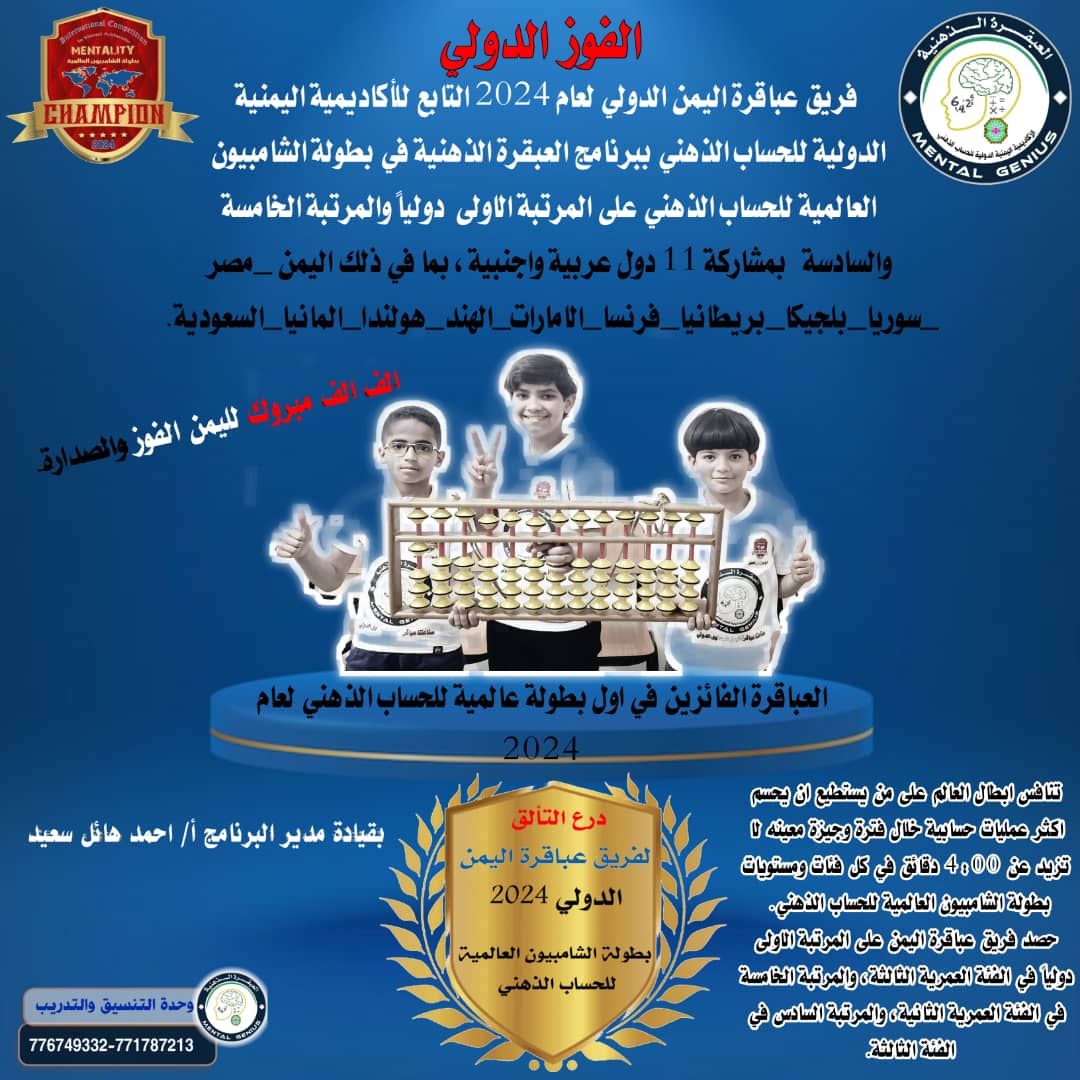 برعاية منظمة المدربين العرب ATO، أعلنت أكاديمية منتالتي في جمهورية مصر العربية مؤخرًا أن أبطال الأكاديمية اليمنية الدولية للحساب الذهني ببرنامج العبقرة الذهنية حصدوا المراكز الأولى في بطولة الشامبيون العالمية 2024 في ثلاث مستويات مختلفة وفقًا للمراحل العمرية وقواعد Arithmetic System لنظم الحساب الذهني.