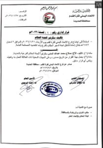 أصدر فرع الاتحاد اليمني لكرة القدم بمحافظة الحديدة القرار رقم (2) لسنة 2026م القاضي بتكليف الحكم المحلي صلاح الماس بمهام سكرتير لجنة حكام كرة القدم بالمحافظة في إطار الإجراءات التنظيمية الرامية إلى تعزيز كفاءة العمل التحكيمي والارتقاء بالأداء الإداري والفني ..