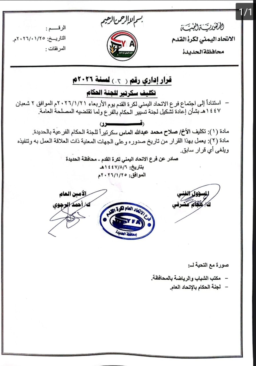 أصدر فرع الاتحاد اليمني لكرة القدم بمحافظة الحديدة القرار رقم (2) لسنة 2026م القاضي بتكليف الحكم المحلي صلاح الماس بمهام سكرتير لجنة حكام كرة القدم بالمحافظة في إطار الإجراءات التنظيمية الرامية إلى تعزيز كفاءة العمل التحكيمي والارتقاء بالأداء الإداري والفني ..