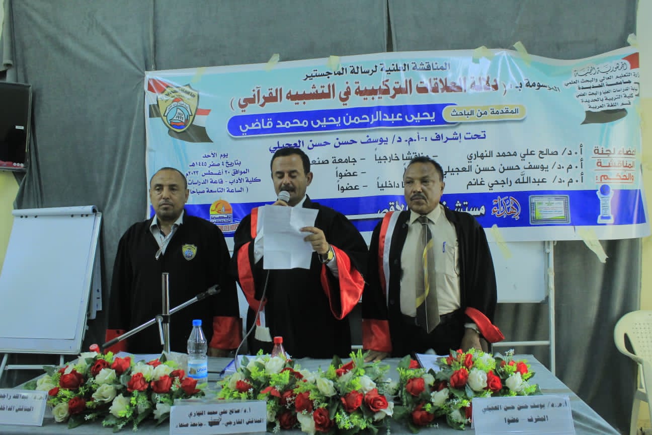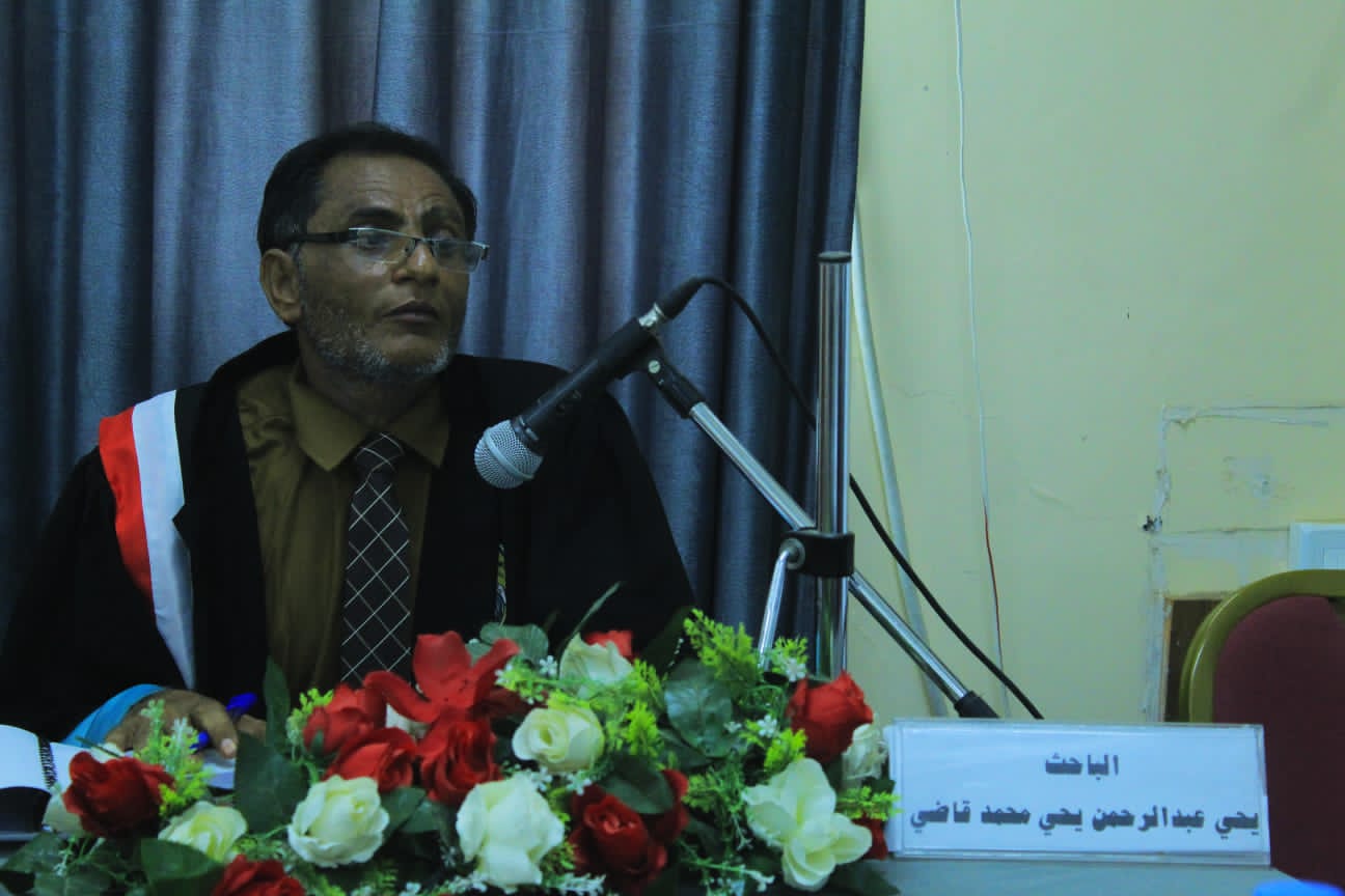 وتكونت لجنة المناقشة والحكم من الدكتور صالح علي النهاري رئيسا ومناقشا خارجيا من جامعة صنعاء والدكتور يوسف حسن العجيلي عضوا ومشرفا – جامعة الحديدة والدكتور عبدالله راجحي غانم عضوا ومناقشا داخليا – جامعة الحديدة.