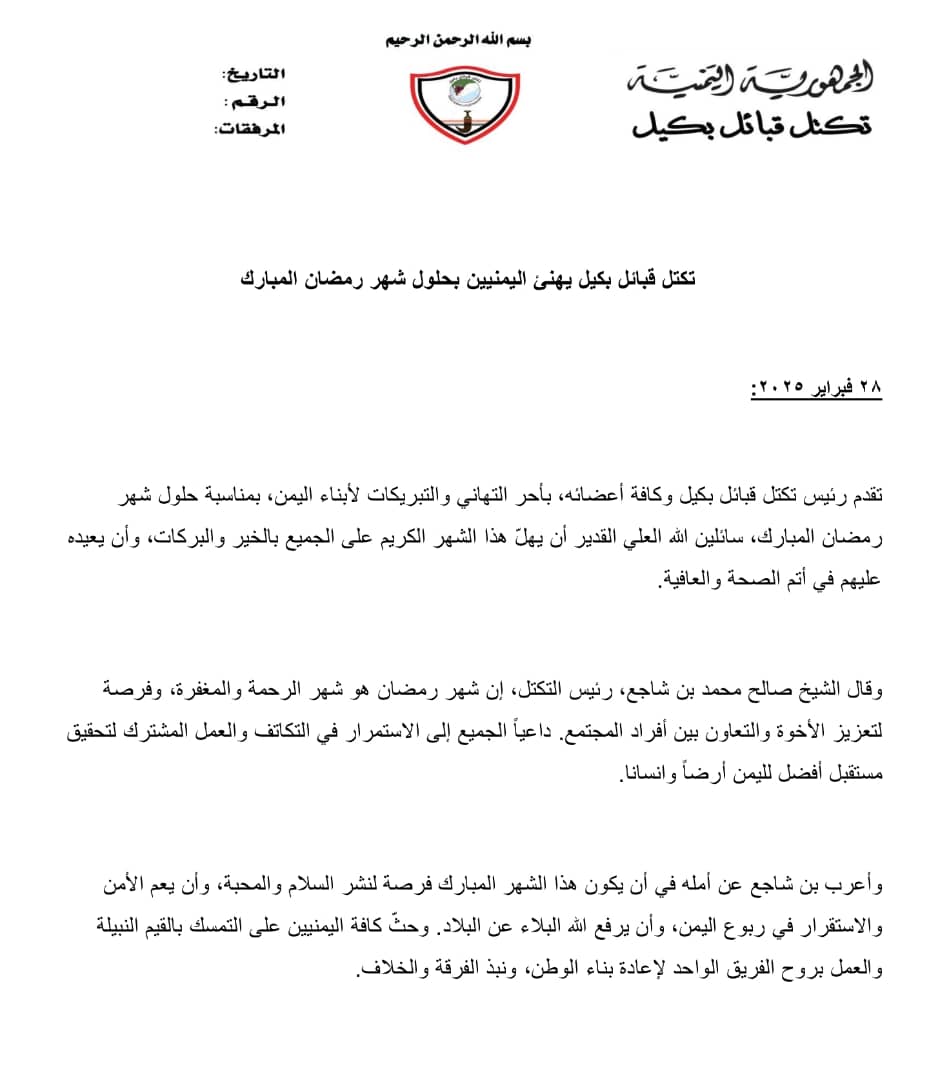 تقدم رئيس تكتل قبائل بكيل وكافة أعضائه، بأحر التهاني والتبريكات لأبناء اليمن، بمناسبة حلول شهر رمضان المبارك، سائلين الله العلي القدير أن يهلّ هذا الشهر الكريم على الجميع بالخير والبركات، وأن يعيده عليهم في أتم الصحة والعافية.