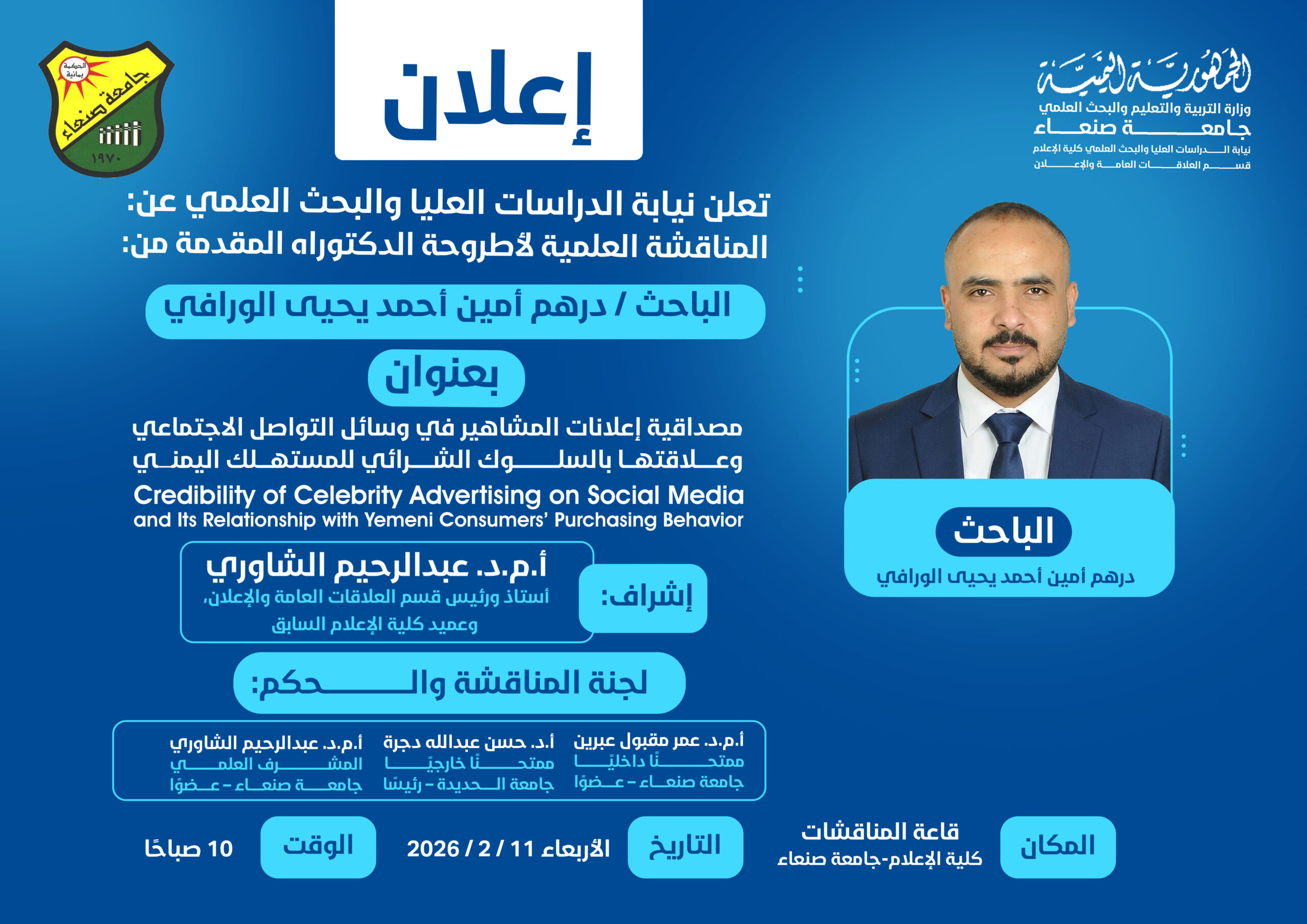 وتأتي هذه المناقشة في إطار حرص كلية الإعلام بجامعة صنعاء على دعم البحث العلمي الرصين، وتشجيع الدراسات الأكاديمية التي تتناول القضايا الإعلامية المعاصرة، وتسهم في فهم تأثيرات الإعلام الرقمي والإعلاني على المجتمع وسلوكياته الاستهلاكية.