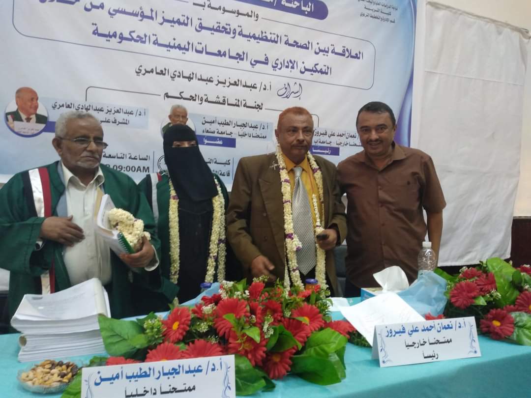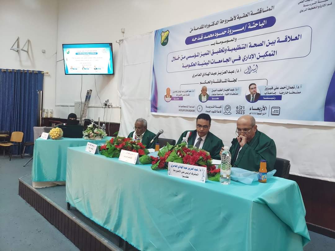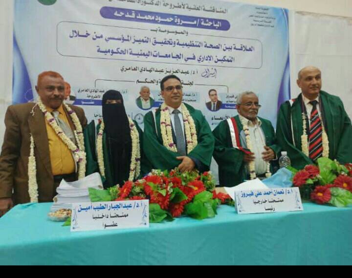 نالت الباحثة مروة حمود محمد قدحه درجة الدكتوراة بإمتياز مع مرتبة الشرف من كلية التربية بجامعه صنعاء عن رسالتها الموسومة بعنوان ( العلاقة بين الصحة التنظيمية وتحقيق التميز المؤسسي من خلال التمكين الإداري في الجامعات اليمنية الحكومية ) ..