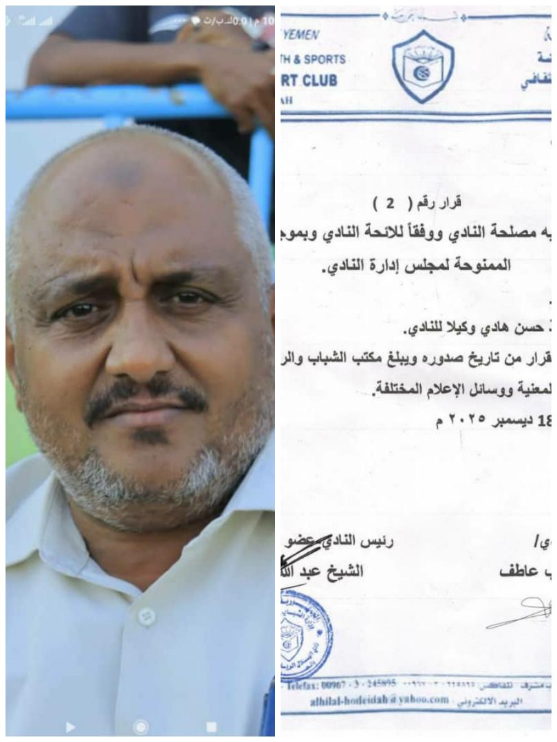 اقرت إدارة نادي الهلال الساحلي بالحديدة تعيين حسن هادي رسمي وكيلا لنادي الهلال ، وبدء مهامه مع النادي ابتداء من اليوم رسميا.