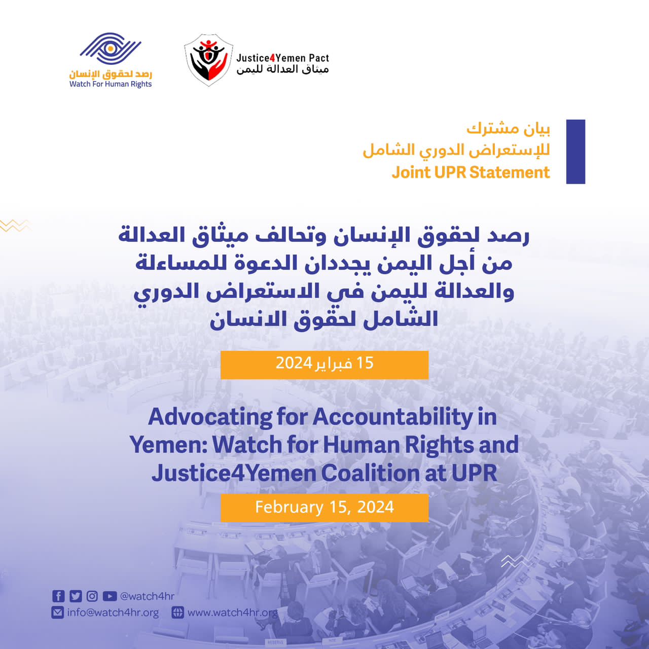 قدمت مؤسسة رصد لحقوق الإنسان Watch4HR بفخر بيانًا مشتركًا للاستعراض الدوري الشامل كعضو نشط في تحالف ميثاق العدالة من أجل اليمن، المدعوم من معهد DT، خلال دورة المراجعة الدورية الشاملة هذا الأسبوع في جنيف. وفي اجتماع مجلس حقوق الإنسان المقام حالياً تناول تحالفنا القضايا العاجلة المتعلقة بانتهاكات حقوق الإنسان في اليمن، بما في ذلك الصراع المستمر والاعتقالات والاختفاء القسري وتأثيرها على المدنيين. حيث شاركت مؤسسة رصد لحقوق الإنسان بشكل قوي وفعال من خلال فعاليتين مهمتين: الجلسات التمهيدية للاستعراض الدوري الشامل وكذلك من خلال تبادل الآراء مع المنظمات غير الحكومية والدول الأعضاء في الاتحاد الأوروبي.