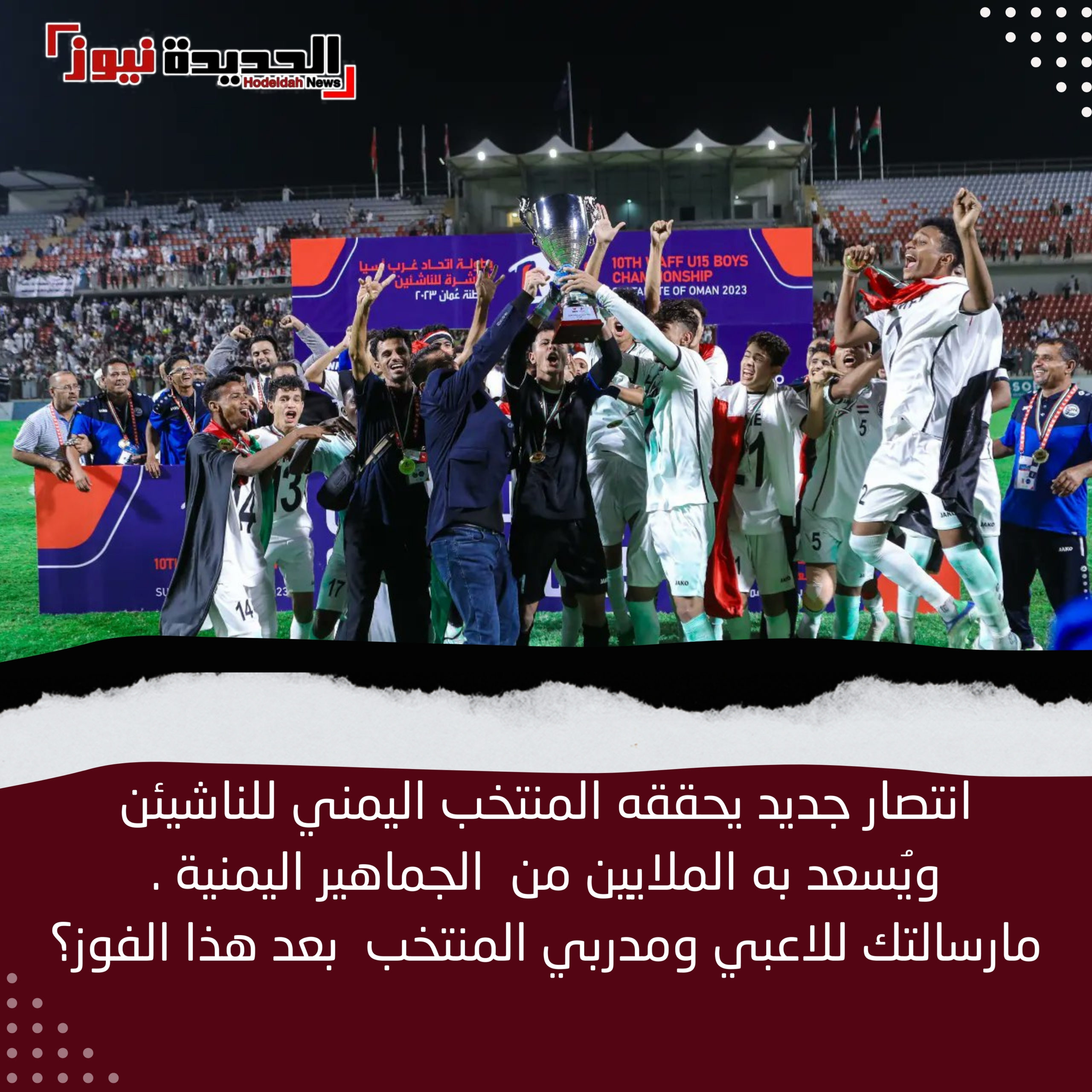 وبارك رجل الاعمال ابوعابد الاحمدي للمنتخب الوطني الناشئين تحقيق البطولة الغاليه متمنيا ان يواصلوا تألقهم وتقديم مستوى يليق بالكرة اليمنية في البطولات القادمة .