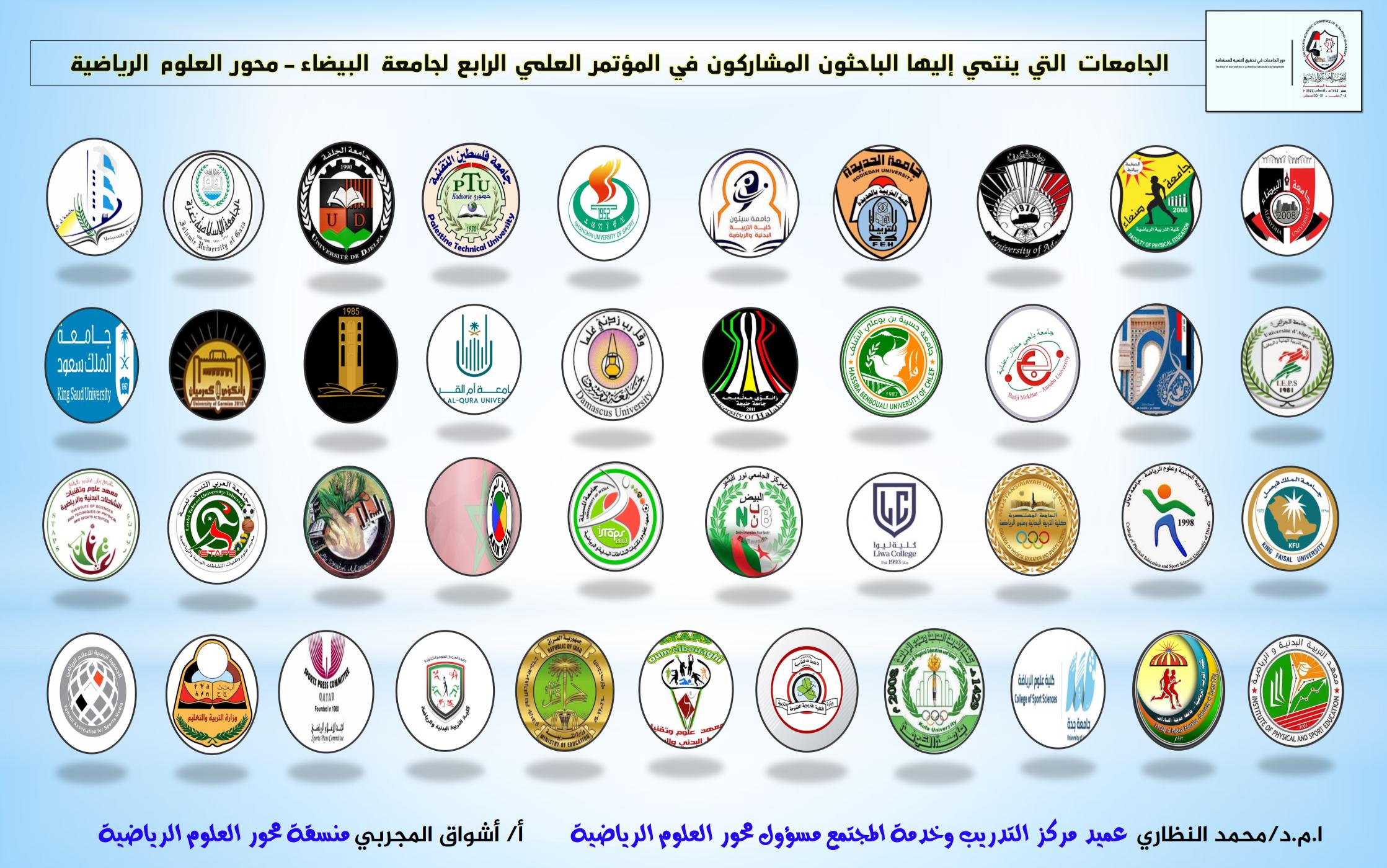حيث يشارك من اليمن جامعات (البيضاء، صنعاء، عدن، الحديدة، سيئون، وزارة الشباب والرياضة، الجمعية اليمنية للإعلام الرياضي، وزارة التربية والتعليم). الصين (جامعة شنقهاي ). الجزائر (جامعات الجزائر ٣، المسيلة، عنابة، الجلفة، الشلف، ام البواقي، تبسة، المبيض). العراق (جامعات المستنصرية، الكوفة، ديالى، حلبجة كردستان، كرميان كردستان، الكلية التربوية المفتوحة وزارة التربية، مديرية التربية الأنبار). السعودية (جامعات جدة، أم القرى، الملك سعود، الملك فيصل). السودان (جامعتي العلوم والتكنولوجيا بالخرطوم، جامعة الخرطوم). فلسطين (الجامعة الاسلامية غزة، جامعة فلسطين التقنية خضوري، مركز السنابل للدراسات والتراث الشعبي). تونس (جامعة صفاقس). مصر (جامعة مدينة السادات). سوريا (جامعة دمشق). الإمارات (كلية ليوا للتكنولوجيا أبوظبي). ليبيا (طرابلس). قطر (لجنة الإعلام الرياضي). المغرب (الاتحاد الدولي لكرة العين).