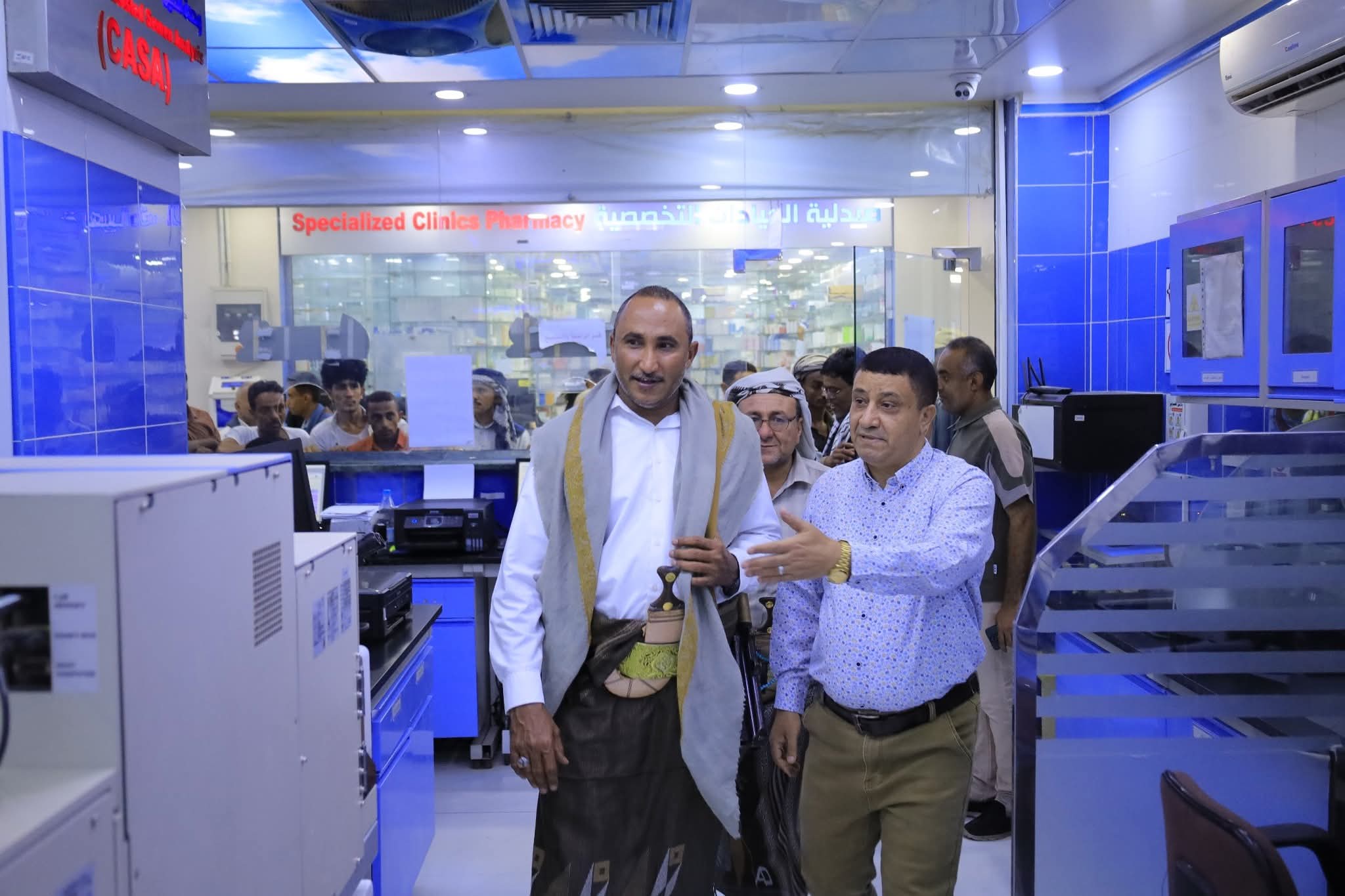 وكان في استقباله مدير عام المستشفى الدكتور عبدالمجيد اليوسفي الذي اصطحبه في جولة داخل عدد من الأقسام والمرافق الصحية والعيادات التخصصية حيث اطلع المحافظ والوفد المرافق له على سير العمل وما تقدمه المستشفى من خدمات استشارية وتشخيصية وعلاجية.
