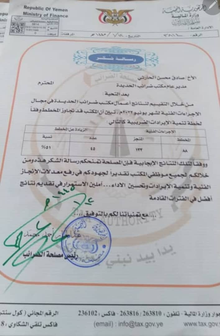 حيث وجه رئيس مصلحة الضرائب الاستاذ عبدالجبار احمد محمد رسالة شكر الى مدير عام مكتب الحديدة الاستاذ صادق محسن حسان الحارثي ذكر فيها أنه من خلال تقييم اعمال مكتب ضرائب الحديدة في مجال الاجراءات الفنية لشهر يونيو 2023م تبين أن المكتب قد تجاوز الهدف المرسوم و المخطط وفقاً لخطة تنمية الايرادات الضريبية بزيادة 151% ، متمنياً لهم المزيد من النجاح والإنجاز وتقديم نتائج أفضل .