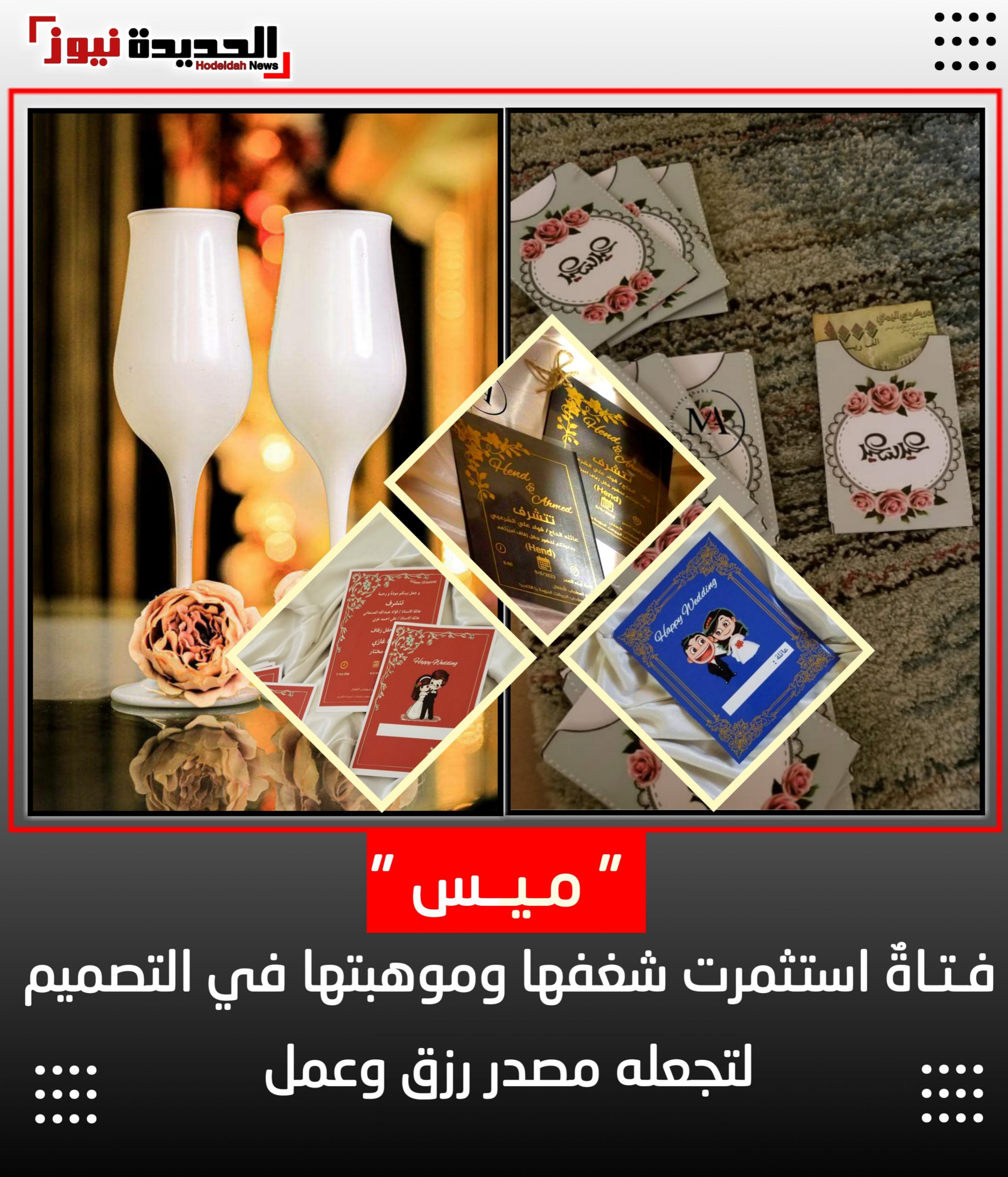 وخصوصاً تصاميم دعوات الزفاف والمناسبات ، مع حرصها على اتباع أسلوب “غير تقليدي”