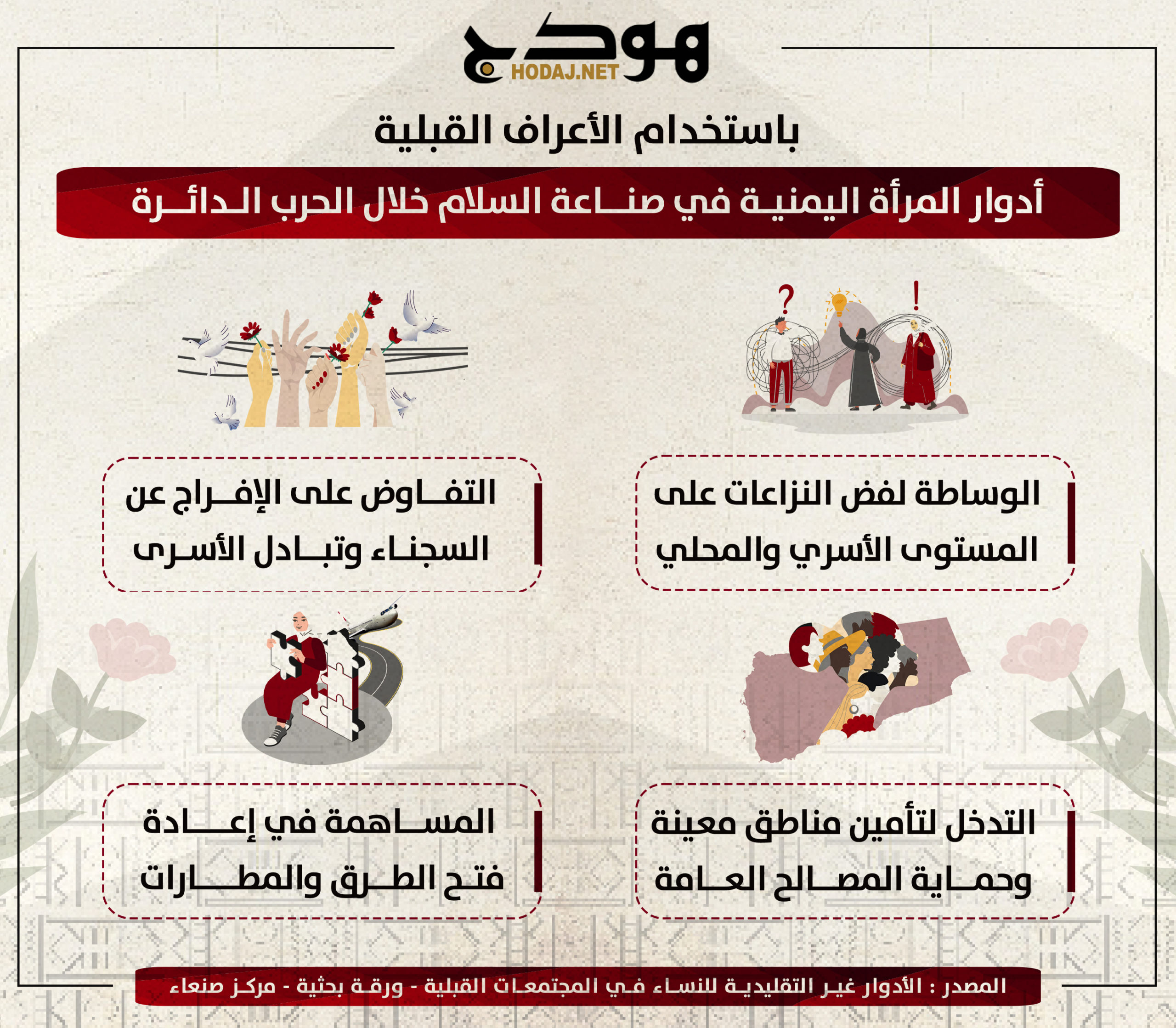 وأوضحت الدراسة أدوارًا رئيسية في حل النزاعات داخل الأسرة والقرية والقبيلة، حيث يمكنهن وقف النزاع بمجرد حضورهن أو فرض حمايتهن حتى يتم التوصل إلى حل. وفي ظل الظروف الصعبة الناتجة عن النزاعات والحروب، أصبحت أدوار المرأة تتجاوز التقاليد، لتشمل فض النزاعات على المستويات الأسرية والمحلية، والتفاوض على الإفراج عن السجناء وتبادل الأسرى.